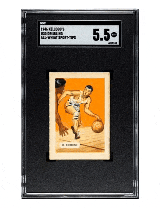 The Esky Cards were sets of numbered jumbo postcards released in packs (pictured here) by Esquire Magazine in 1945. This #2 Hank Luisetti card was the only basketball card in their "Great Moments in Sports" set #14, which also notably included a Bobby Jones golf card. The image on the card is from the painting "Luisetti Scores Again" by James Bingham, which features Luisetti playing in a game at Madison Square Garden in 1936. The painting was also featured in Esquire Magazine in 1944. There are only a couple graded examples of this card.
