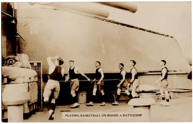 1920s PHOTO POSTCARD OF MEN PLAYING BASKETBALL ON THE DECK OF A MILITARY BATTLESHIP
