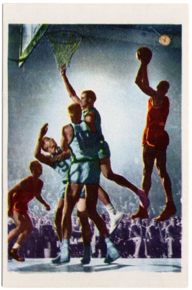 There was a massive 675 cards in the Didasco set and they featured a variety of popular sports at the time. There were 15 total basketball cards, the majority of which showing Italian matches vs. other world teams. Due to the teams involved in the matches, these cards have been determined to feature the 1948 Olympic games in London. The Albosport album has many cards that highlight the 1948 games and the Olympics symbol is featured on the cover. There are also 3 cards that feature the Harlem Globetrotters. Two of them are of the team and one is a solo card for one-armed Globetrotter, Boyd Buie, which I believe is the only card ever featuring him as a player. Measurements: 1.25" x 1.5"